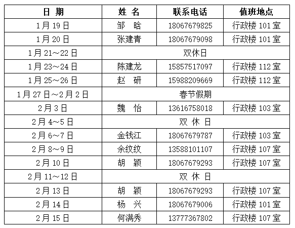 1月20日之前正常上班;1月21日至2月13日放假,不安排值班;2月14日起恢复正常上班。